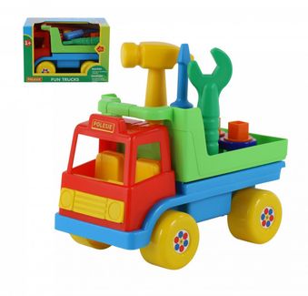 Автомобиль "Техпомощь" является развивающей игрушкой для детей до 3-х лет. Крышка кузова автомобиля откидывается за ручку над кабиной, и в таком положении тоже является рабочей поверхностью. None