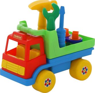 Автомобиль "Техпомощь" является развивающей игрушкой для детей до 3-х лет. Крышка кузова автомобиля откидывается за ручку над кабиной, и в таком положении тоже является рабочей поверхностью. None