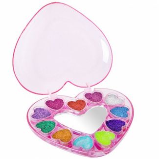 В набор входят косметичка-сердце с тенями для век с блестками (11 оттенков, 7,7г.), зеркальце.