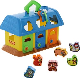 Развивающая игрушка для детей до 3-х лет в виде домика. На крыше домика 6 отверстий-пазлов в форме разных зверюшек, куда малыш подбирает и вкладывает соответствующие фигурки/детальки. None