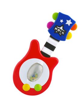 Веселая игрушка контрастных цветов выглядит как настоящий музыкальный инструмент и даже играет мелодии в стиле "рок". None