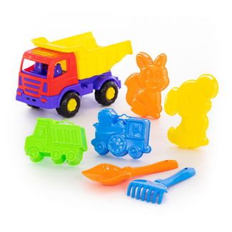 - Набор №184: Мираж, автомобиль-самосвал + лопатка №5, грабельки №5, формочки (самосвал + паровоз + белочка + пёсик) по выгодной цене 364 р. руб.;