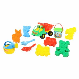 Набор №211 (в рюкзаке): Муравей, автомобиль-самосвал + ведро малое с наклейкой, лопатка №5, грабельки №5, формочки (самосвал + паровоз + белочка + пёсик + котёнок + медведь), лейка малая №4