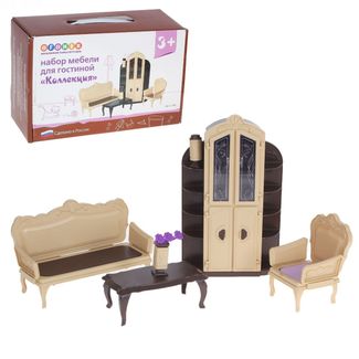 Набор мебели для гостиной Коллекция от производителя Огонек - шикарная детская мебель для сюжетно-ролевых игр, которая выполнены под дерево. Она укомплектована всем необходимым, чтобы создать уют в гостевой комнате домика. Здесь есть диван, кресло, журнальный столик , шкаф с открывающимися дверцами и две вазы. Классический стиль и цветовая гамма гарнитура помогут воссоздать добротный интерьер в кукольном домике. Подходит для кукол размером до 20 см. Минимальная сумма заказа 1500 руб. Возможен самовывоз. Есть доставка.
