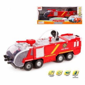 Игрушечная машина «Пожарная» с водяной пушкой, стреляющей водой, выполнена очень реалистично, поэтому внешне очень похожа на настоящую. В игрушке предусмотрены эффектные светозвуковые функции: при включении она воспроизводит звук сирены и светится двумя цветами. Машинка осуществляет произвольные движения. Для того, чтобы водяная пушка стреляла, в игрушку нужно налить воду через специальную воронку и нажимать на круглую кнопку.