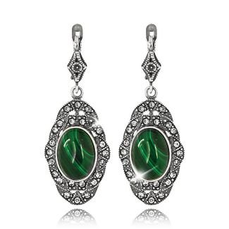 Камень: малахит. В изделии применяются синтетические камни, имитирующие натуральные. Металл: посеребрение, мельхиор. Тип замка: английский. Размер серег: 4,4 x 1,7 см. Вставки: Swarovski. None Возможен самовывоз. Есть доставка.
