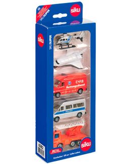 В набор Siku входит пожарная машина, скорая помощь, полицейский фургон, вертолёт и самолет. Модели выполнены из ударопрочного металла и пластика. Машинки можно катать, винт вертолёта вращается. Минимальная сумма заказа 1500 руб. Возможен самовывоз. Есть доставка.