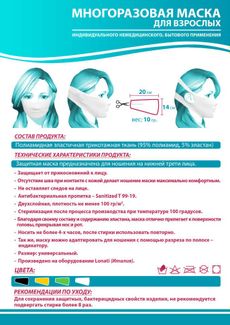 Настоящие технические условия распространяются на маску для взрослых индивидуального немедицинского (бытового) применения, марки: Demi Round, «САРРАС» (далее – маска, изделие), предназначенные для использования в пищевой, перерабатывающей промышленности, косметологии, в быту, а так же в местах повышенного скопления людей. Маска предназначена для обеспечения барьера, для прямой передачи биологических жидкостей от носителя маски другим людям, для фильтрации воздуха при дыхании в целях предупреждения распространения воздушно-капельной инфекции. Маска представляет собой многоразовое, нестерильное изделие, закрывающее рот и нос носителя. Маска изготовлена из синтетических материалов и обработана дезинфицирующей субстанцией «Санитайзед Т 99-19» (Sanitized T 99-19), обеспечивает высокий уровень фильтрации и сохраняет свободное комфортное дыхание, а также возможность ведения разговора во время работы. Маска предназначена для использования во всех климатических регионах (поясах). Минимальный заказ - 100 руб.