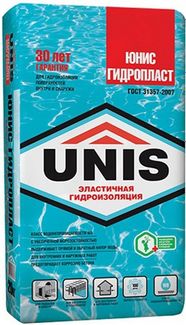 - ЮНИС Гидропласт гидроизоляция цементная обмазочная (20кг) UNIS Гидропласт эластичная гидроизоляция (20кг) по выгодной цене 695 р. руб.;