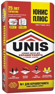 - ЮНИС Плюс клей плиточный (25кг) UNIS Plus клей для укладки керамической плитки и керамогранита (25кг) по выгодной цене 319 р. руб.;