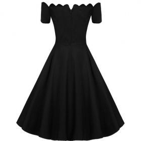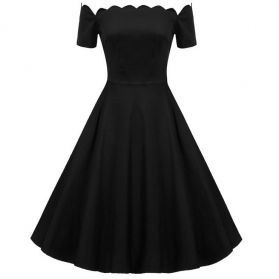 Прекрасное черное платье романтичного дизайна идеально подойдет для вечернего образа. Изделие приталенного кроя с юбкой-клеш, открытыми плечами и коротким рукавом. Декорировано волнистой окантовкой по линии декольте. На спинке молния. В наличии S 1 шт None Есть доставка.