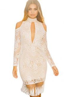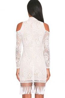 Кружевное платье стильного дизайна. Изделие приталенного кроя с длинным рукавом. Декорировано бахромой, вырезом на груди и плечах. Отлично подойдет для современной модницы. В наличии S 1 шт None Есть доставка.