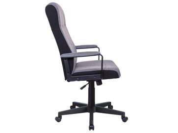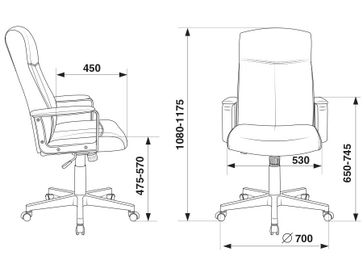 Характеристики: <br> Материал крестовины, колес и подлокотников: пластик.<br> Материал обивки: ткань.<br> Механизм качания с регулировкой кресла под вес сидящего и фиксацией спинки в вертикальном положении.<br> Механизм регулировки высоты: газ-лифт.<br> Диаметр крестовины: 700 мм.<br> На газлифте имеется стакан.<br> Колесики оборудованы специальным тормозом безопасности.<br> Диапазон высоты кресла: 1080-1175 мм.<br> Диапазон высоты от пола до сиденья: 475-570 мм.<br> Диапазон высоты от пола до подлокотников: 650-745 мм.<br> Размер сиденья (ШхГ): 530 х 450 мм.<br> Максимальная нагрузка: 120 кг.<br> None Страна производства: Россия