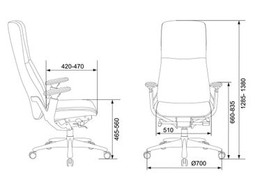 Характеристики: <br> Материал крестовины: алюминий.<br> Материал подлокотников: алюминий, полиуретан.<br> Материал обивки: натуральная кожа, экокожа.<br> Материал колес: полиуретан.<br> Регулируемая высота сиденья: 465-560 мм.<br> Регулируемая высота подлокотников: 195-275 мм.<br> Регулируемая глубина сиденья: 420-470 мм.<br> Механизм регулировки высоты: газлифт.<br> Механизм качания: синхромеханизм.<br> Максимальная нагрузка: 150 кг.<br> None Страна производства: Россия
