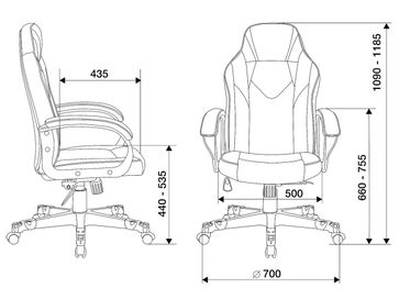 Характеристики: <br> Материал крестовины и колес: пластик.<br> Диаметр крестовины: 700 мм.<br> Материал подлокотников: пластик с мягкими накладками.<br> Диаметр колес: 50 мм.<br> Механизм регулировки высоты: газлифт.<br> Механизм качания: с фиксацией в любом положении.<br> Регулируемая высота сиденья: 440-535 мм.<br> Габариты сиденья (ШхГ): 500 х 435 мм.<br> Максимальная нагрузка: 181 кг.<br> None Страна производства: Россия
