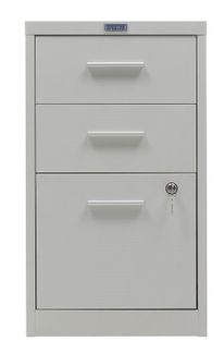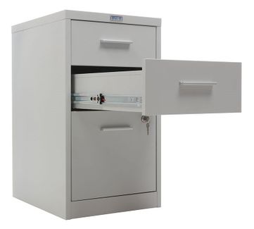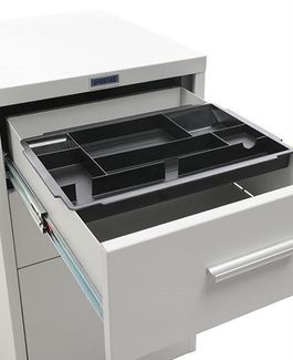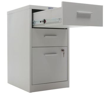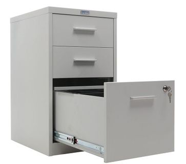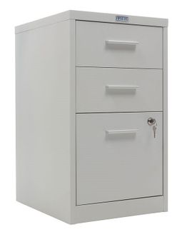 компактные размеры помогают сэкономить пространство два вида выдвижных ящиков- файловые для хранения подвесных папок формат А4 и канцелярские жесткий стальной корпус изготовлен из цельного листа металла ящики оборудованы роликовыми направляющими полного выдвижения ключевой замок Практик (2000 комбинаций) запирает верхний и нижний ящик одновременно нагрузка на ящики для канцелярских принадлежностей- 5 кг, на файловые- 15 кг лоток для канцелярских принадлежностей в комплекте поставляются в собранном виде Количество ящиков: 3 Формат документов: А4 Цвет: серый металлик муар (RAL 9006) Тип покрытия: порошковое None
