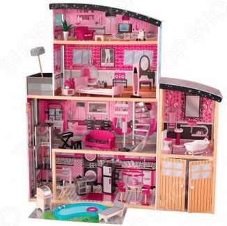 Кукольный домик заветная мечта каждой девочки Не секрет, что каждая девочка мечтает о своем кукольном домике. В списке детских подарков эта игрушка числится одной из самых желанных, заветных и востребованных. Почему спросите вы. Думаем, ответ очевиден: кукольный домик это не просто игрушка, это целая игровая площадка! Кукольный дом с аксессуарами KidKraft Сияние станет чудесным подарком для вашей маленькой принцессы. Теперь игры с любимыми куклами будут еще интересней и увлекательней! Что немаловажно, они станут и более приближены к реальной жизни, ведь не секрет, что дети склонны во всем подражать взрослым. В процессе таких игр малыши не только учатся выстраивать отношения с окружающими, но и примеряют на себя различные социальные роли. Совсем как настоящий Домик очень просторный и уютный, выполнен из натурального дерева и предназначен для кукол размером не более 30 см Barbie, Monster High, Winx, Bratz, Ever After High и др. . Он имеет частично открытую конструкцию и насчитывает целых четыре этажа. При этом, с первого на второй этаж можно подняться на лифте, а со второго на третий по винтовой лестнице. 1 этаж гараж и, совмещенная со столовой, кухня. 2 этаж просторная гостиная и ванная комната. 3 этаж спальня с балконом. 4 этаж комната отдыха. Каждая комната имеет свой неповторимый дизайн и отличается великолепной проработкой деталей. Достигается это, благодаря художественному украшению стен и наличию большого количества разнообразных аксессуаров: Кухня холодильник, кухонная стойка с мойкой и плитой, гладильная доска с утюгом, круглый столик с двумя стульчиками и игрушечный тортик. Ванная комната ванна, унитаз и умывальник. Гостиная диванчик, торшер и синтезатор с пуфиком. Спальня кровать, напольное зеркало, люстра и прикроватная тумбочка с настольной лампой. Балкон зонт для защиты от солнца. Комната отдыха кресло, журнальный столик, комнатный цветочек, плазменный телевизор и питомец в лежаке. Внутренний дворик бассейн, шезлонг и садовый гриль. Что прим