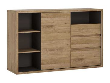 Универсальный комод с открытыми полками, дверкой и ящиками - благодаря этому в нем можно разместить как личные вещи, так и фотографии, статуэтки, книги, которые вы хотели бы показать гостям; Дверки и ящики открываются за ручки-выемки; За центральной дверкой две полки; В правой части три выдвижных ящика, при чём нижний самый большой и вместительный; Открытые полки сделаны в сочетании серого и цвета натурального дуба. Необходима предоплата. Возможна рассрочка. Страна производства: Польша Возможен самовывоз. Есть доставка.