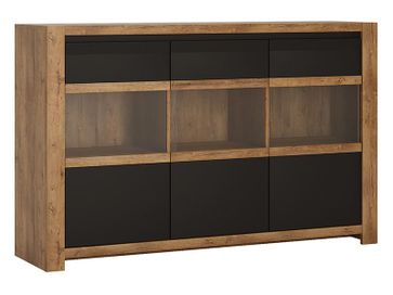 Широкий остекленный 3-дверный комод, оборудованный подсветкой;За каждой дверкой по 2 полки;Дверцы открываются за ручки-выемки. Рядом с ручками-выемками фасад имеет декоративное рифление, благодаря чему на фасаде не остается следов от пальцев. Необходима предоплата. Возможна рассрочка. Страна производства: Польша Возможен самовывоз. Есть доставка.