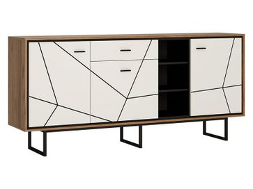 Широкий комод на металлических ножках в современном стиле с открытой частью. На полках в открытой части можно разместить фотографии, статуэтки; За каждой дверцей находится по 1 полке; Дверцы оборудованы системой тихого закрывания. Необходима предоплата. Возможна рассрочка. Страна производства: Польша Возможен самовывоз. Есть доставка.