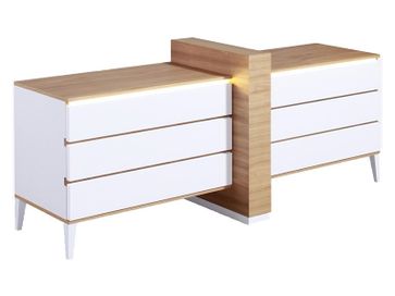Вместительный комод необычной формы;Справа и слева расположено 6 выдвижных ящиков;Ящики оборудованы системой тихого закрывания;Центральная перегородка выступает за край комода на 12 см.;Над ручками-выемками расположена подсветка, которая подчеркнет необычные формы мебели. При выдвижении верхнего ящика подсветка осветит внутреннюю часть ящика. Необходима предоплата. Возможна рассрочка. Страна производства: Польша Возможен самовывоз. Есть доставка.