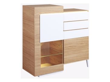 Вместительный высокий комод необычной формы;В верхней правой части расположено 3 выдвижных ящика;В нижней правой части дверца, за которой находится полка;Левая дверца имеет как остекленную, там и не остекленную часть. За остекленной частью дверцы расположены полки, оборудованные подсветкой - на них можно расположить вазы, статуэтки, фотографии, посуду. За не остекленной частью дверцы на полках можно разместить одежду в сложенном виде, скатерти и другие предметы;Ящики оборудованы системой тихого закрывания;Над ручками-выемками расположена подсветка, которая подчеркнет необычные формы мебели. При выдвижении верхнего ящика подсветка осветит внутреннюю часть ящика. Необходима предоплата. Возможна рассрочка. Страна производства: Польша Возможен самовывоз. Есть доставка.