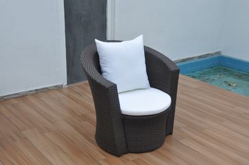 В современном стиле из искусственного ротанга ручного плетения. Каркас мебели выполнен из алюминиевых труб, подушки дивана и кресел выполнены из влагостойкой ткани. Толщина матраца и подушек ― 8см. Журнальный столик покрыт закаленным стеклом.