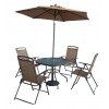 Комплект мебели TJF-T007 состоит из четырех удобных кресел, круглого стола со стеклянной столешницей и большого зонта, защищающего от солнца и дождя.