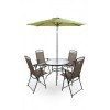 Комплект мебели TJF-T007 состоит из четырех удобных кресел, круглого стола со стеклянной столешницей и большого зонта, защищающего от солнца и дождя.