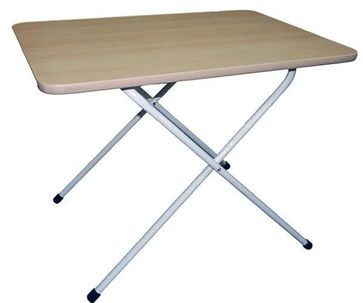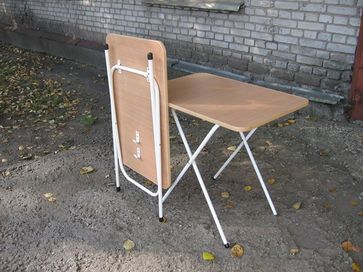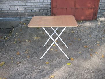 Компактный и легкий складной стол, отличающийся лаконичным дизайном, может использоваться в качестве торгового оборудования, имеет столешницу размером 0,75*0,5 метра, изготовленную из ламинированного ДСП и имеющую два положения по высоте: 55 см и 65 см и ножки изготовленные из стальной трубы Ø 18 мм. None