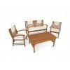 Ансамбль в колониальном стиле включает четыре предмета: невысокий столик, два кресла и диван со спинкой. Все предметы монолитные, выполнены из натурального дерева с использованием комбинированных технологий. Стильный светло-коричневый цвет и классические формы гарнитура позволят прекрасно оформить пространство зала или веранды загородного дома. Комфортабельный отдых обеспечивают мягкие подушки с поролоновым наполнителем и анатомический изгиб спинки у кресел и скамейки-дивана. Специальное покрытие предохраняет мебель от воздействия влаги и порчи со стороны насекомых. Особого ухода мебель не требует.