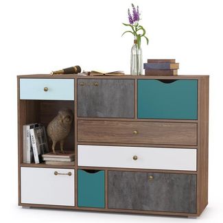 Комод Вайс 10.104. Цвет - винтаж/камень тёмный/бензин/белый премиум. Размер (ШхГхВ) 121х40х89 см. Эксклюзивный комод необычен всем - стильным калейдоскопом цветов, оригинальным дизайном и комбинацией элементов. Конструкция комода включает - два закрытых распашной дверкой отделения, открытую нишу и шесть различных выдвижных ящика. None Есть доставка.