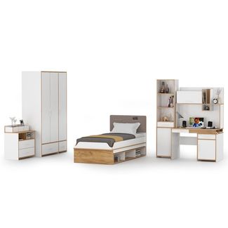 Молодёжная комната Вуди № 2. Цвет - белый премиум/дуб крафт золотой. Комплектация - кровать с тумбочкой, шкаф для одежды, комод и письменный стол с полкой и стеллажом. Спальное место 900х2000 мм. Основание под матрас (ЛДПС) в комплекте, матрас приобретается отдельно. Гармония и позитив! None Есть доставка.