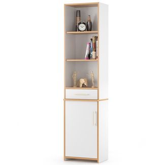 Стеллаж Вуди 10.127. Цвет - белый премиум/дуб крафт золотой. Размер (ШхГхВ) 46х34х190 см. Компактный, комбинированный стеллаж с большими возможностями. Верхняя часть стеллажа открытая, с двумя полками, нижняя - закрытая, распашная, с одной полкой; по центру - выдвижной ящик None Есть доставка.