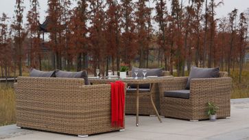 Высококачественный и неприхотливый искусственный ротанг серо-желтого оттенка Круглое плетение Прочный алюминиевый каркас, выдерживающий до 200 кг Подушки выполнены из водостойкой полиэфирной ткани для защиты мебели от дождя и солнца Съемные чехлы серого цвета Алюминиевое основание ножек Столешница обеденного стола изготовлена из крепкого закалённого стекла толщиной 5 мм Вся мебель сделана вручную нашими квалифицированными специалистами В солнечных лучах плетение приобретает более светлый и яркий оттенок Подходит для использования внутри помещения и на открытом воздухе