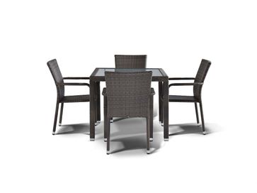 На 4 персоны из искусственного ротанга обеспечит удобство и уют обедающей компании. Прочный каркас изготовлен из алюминия, что гарантирует продолжительный срок службы модели. Стулья с удобными подлокотниками и подушкой отличаются повышенным удобством. Ручное плетение делает неповторимым и уникальным каждое изделие. Вместительный стол квадратной формы выгодно дополнен стеклянной столешницей толщиной 5мм, что делает его более практичным в использовании. Это безупречное сочетание качества, практичности и природных мотивов.