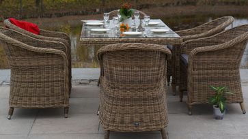 Высококачественный и неприхотливый искусственный ротанг серо-желтого оттенка Круглое плетение Прочный алюминиевый каркас, выдерживающий до 200 кг Подушки выполнены из водостойкой полиэфирной ткани для защиты мебели от дождя и солнца Съемные чехлы серого цвета Алюминиевое основание ножек Столешница обеденного стола изготовлена из крепкого закалённого стекла толщиной 5 мм Вся мебель сделана вручную нашими квалифицированными специалистами В солнечных лучах плетение приобретает более светлый и яркий оттенок Подходит для использования внутри помещения и на открытом воздухе