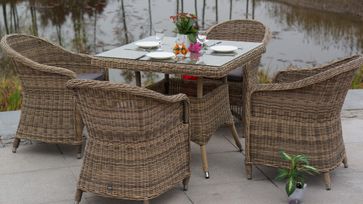 Высококачественный и неприхотливый искусственный ротанг серо-желтого оттенка Круглое плетение Прочный алюминиевый каркас, выдерживающий до 200 кг Подушки выполнены из водостойкой полиэфирной ткани для защиты мебели от дождя и солнца Съемные чехлы серого цвета Алюминиевое основание ножек Столешница обеденного стола изготовлена из крепкого закалённого стекла толщиной 5 мм Вся мебель сделана вручную нашими квалифицированными специалистами В солнечных лучах плетение приобретает более светлый и яркий оттенок Подходит для использования внутри помещения и на открытом воздухе