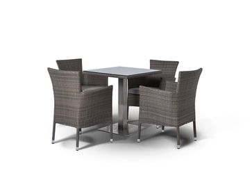 На 4 персоны из искусственного ротанга обеспечит удобство и уют обедающей компании. Прочный каркас изготовлен из алюминия, что гарантирует продолжительный срок службы модели. Стулья с удобными подлокотниками и подушкой отличаются повышенным удобством. Ручное плетение делает неповторимым и уникальным каждое изделие. Вместительный стол квадратной формы выгодно дополнен стеклянной столешницей толщиной 5мм и алюминиевой отделкой подстолья, что делает его более практичным в использовании. Это безупречное сочетание качества, практичности и природных мотивов.