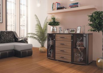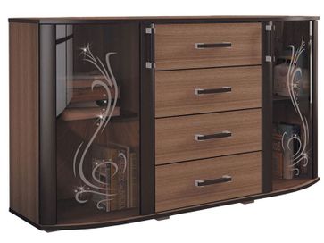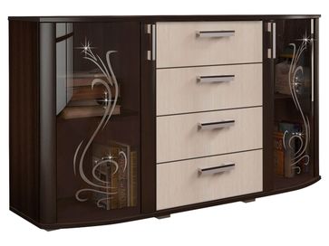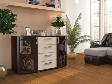 Комод Грация — настоящий идеал изящества и утонченности. Внешний вид модели пленяет, а богатое внутренне наполнение превращает в эталон функциональности. Фасад представляет собой чудесный тандем стеклянных и деревянных элементов. Центральная часть отведена под четыре выдвижных ящика с удобными ручками. По бокам изысканно разместились распашные шкафчики с тонированными дверцами, украшенные витиеватыми узорами и стразами.<br>