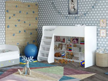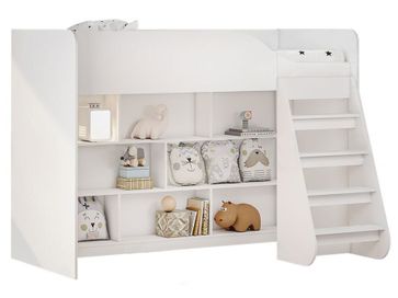 Характеристики: <br>Материал каркаса: ЛДСП.<br> Рекомендуемая высота матраса: 180-200 мм.<br> Максимальная нагрузка на спальное место: 100 кг.<br> Максимальная нагрузка на лестничную перекладину: 70 кг.<br> Ориентация сборки: универсальная.<br> Наполнение: открытый стеллаж с полочками.<br> <br>