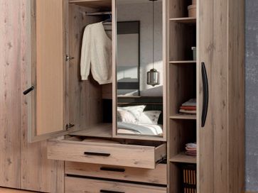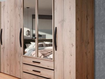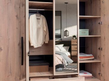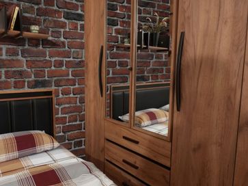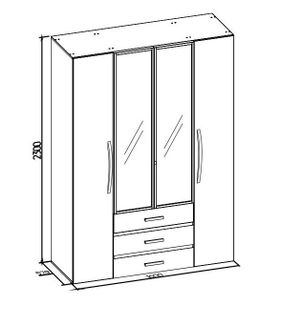 Преимущества: <br> внутри штанга и полки — для одежды на плечиках и сложенных стопок вещей;<br> три выдвижных ящика — заменят комод в небольшой спальне, удобно хранить белье и аксессуары;<br> шариковые направляющие — делают ход выдвижных ящиков плавным и бесшумным;<br> зеркальные створки с защитной пленкой — можно обойтись без зеркала в комнате, так как оно есть в комплектации шкафа; задняя сторона зеркал оклеена специальной пленкой, которая не позволит осколкам упасть в случае повреждения полотна;<br> регулируемые опоры — помогут скомпенсировать неровности напольного покрытия.<br><br>