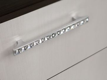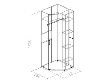 Вместительный угловой распашной шкаф Виспа оборудован рядом полок, стационарной штангой для вешалок, а также встроенной подсветкой в крышке, которая позволит вам быстро находить нужные вещи. Аккуратная металлическая ручка на фасаде декорирована стразами.<br>