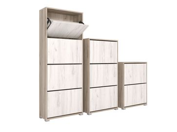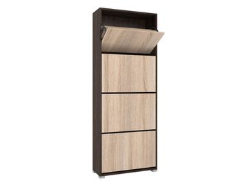 Высокая неглубокая обувница Танго с четырьмя закрытыми отделениями станет удачным выбором в небольшую прихожую. За каждым откидным фасадом есть по две полки, где хватит места для всей сезонной обуви. На столешнице можно разложить нужные под рукой мелочи.<br> Характеристики: <br> Материал корпуса и фасадов: ЛДСП, кромка ПВХ.<br> Материал задней стенки: ДВП.<br> Материал опор: пластик.<br> Механизм открывания: откидной, без ручек.<br>