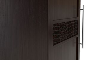 Вместительный угловой распашной шкаф Парма — отличный вариант для хранения вещей и одежды в спальне или гостиной. Фасад модели декорирован вставкой, имитирующей кожу каймана — стильное дизайнерское решение. Внутри располагаются штанга и ряд полок. Внутреннее пространство позволяет хранить габаритные вещи, коробки с обувью.<br /> Шкаф универсальный: собирается на правую и на левую сторону, дверь можно навесить с любой стороны.<br>