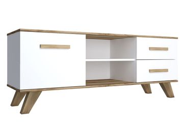ТВ-тумба Вега Скандинавия — это сочетание стиля и практичности. Модель оснащена двумя ящиками полного выдвижения, а также отделением за распашной дверкой. В открытых нишах можно разместить игровую приставку и другие необходимые вещи. Высокие ножки не перегружают обстановку и позволяют удобно проводить уборку. Петли с доводчиком обеспечат плавное и бесшумное закрывание дверки.<br> Характеристики: <br> Материал корпуса: ЛДСП.<br> Материал фасада и ручек: МДФ.<br> Тип направляющих: шариковые длиной 350 мм.<br> None Страна производства: Россия