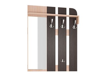 Данная модель оснащена зеркалом, в которое полезно заглянуть перед выходом из дома. А также вешалка имеет антресольную полку, где удобно хранить головные уборы и перчатки. Модель имеет три трехрожковых крючка для верхней одежды и один крючок для сумок.<br>