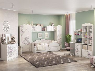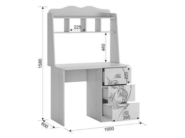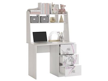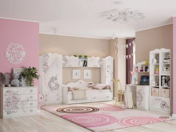 Преимущества:<br> удобная столешница — достаточно места для учебы или работы за компьютером;<br> нежный рисунок на фасаде — создаст хорошее настроение и вдохновит на творчество;<br> модульная серия — возможность выдержать интерьер в общем стиле;<br> функциональная композиция — два выдвижных ящика на роликовых направляющих и изящная надстройка позволят разместить все необходимое под рукой.<br><br> Шкаф выполнен из ЛДСП 16 мм, края обработаны кромкой ПВХ 0,4 мм. Рисунок устойчив к истиранию и ультрафиолету.<br> На открытых полках можно разместить школьные принадлежности, учебники или сувениры.<br /> Тумбу с тремя просторными выдвижными ящиками можно расположить как слева, так и справа. None Страна производства: Россия
