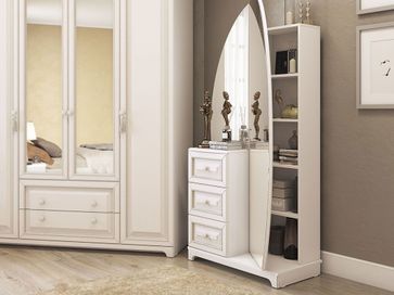 Напольное зеркало с ящиками Белла — неординарный предмет мебели, который украсит интерьер и позволит поддерживать порядок в комнате. За двумя зеркальными поверхностями скрываются ниши с полками, где можно разместить множество полезных вещей. Зеркала установлены на петли с доводчиками, благодаря которым дверцы будут закрываться плавно и бесшумно. В основании полотна имеется тумба с тремя выдвижными ящиками.<br>