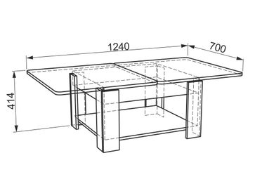 Характеристики: <br> Материалы: ЛДСП 16 мм, кромка ПВХ 0,4 мм.<br> Материал колесиков: пластик.<br> Механизм трансформации: поворотно-раскладной.<br> Размер в разложенном виде (ВхШхГ): 414 х 1240 х 700 мм.<br>